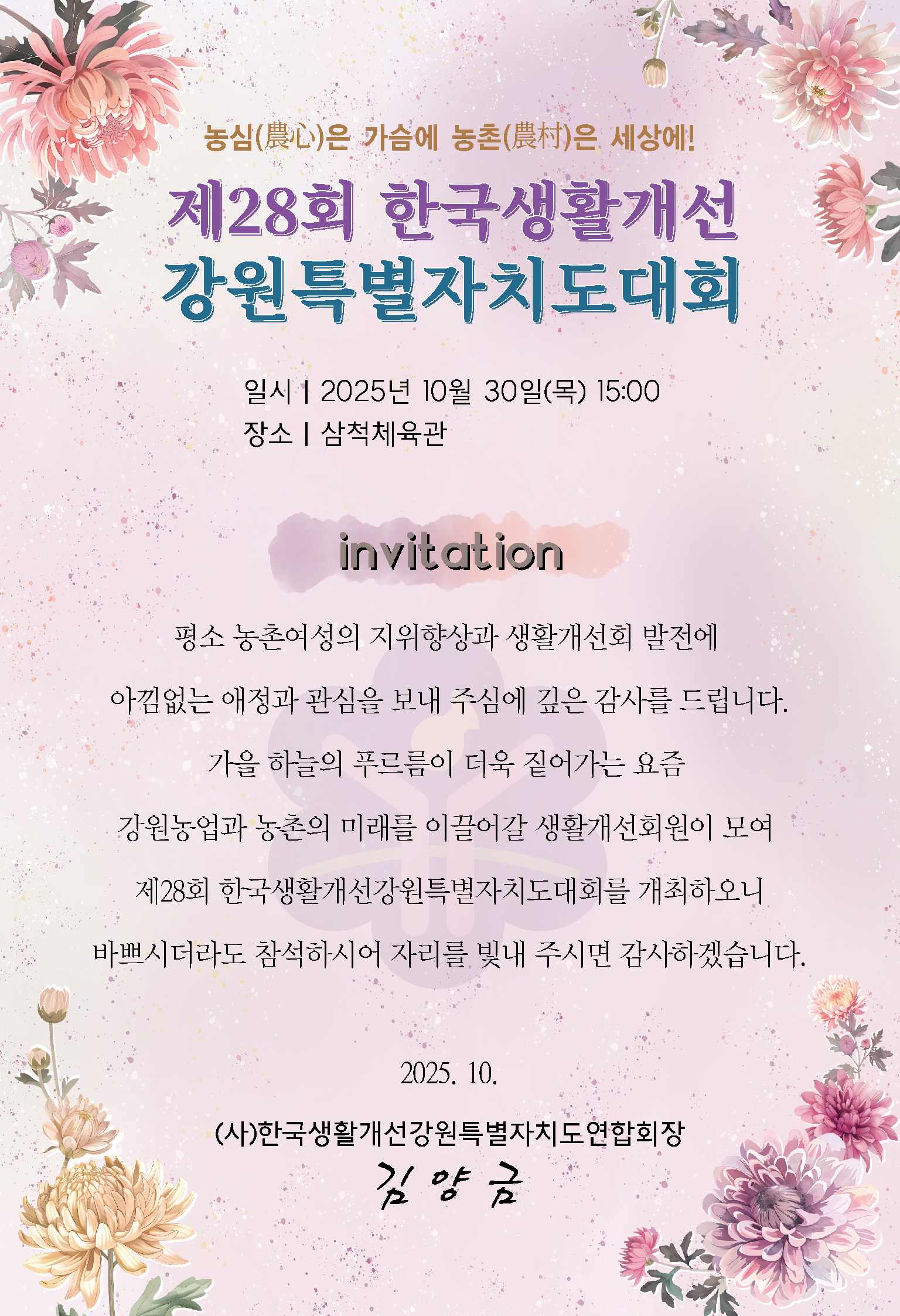 제28회 한국생활개선 강원특별자치도대회 (2025.10.30) 작성자생활개선중앙연합회 등록일2025.10.02 조회수15 목록보기 PREV 제13회 서울 농업인 한마음 대회 (2025.10.23) NEXT 2025 전남생활개선회원 한마음대회 (2025.10.29)