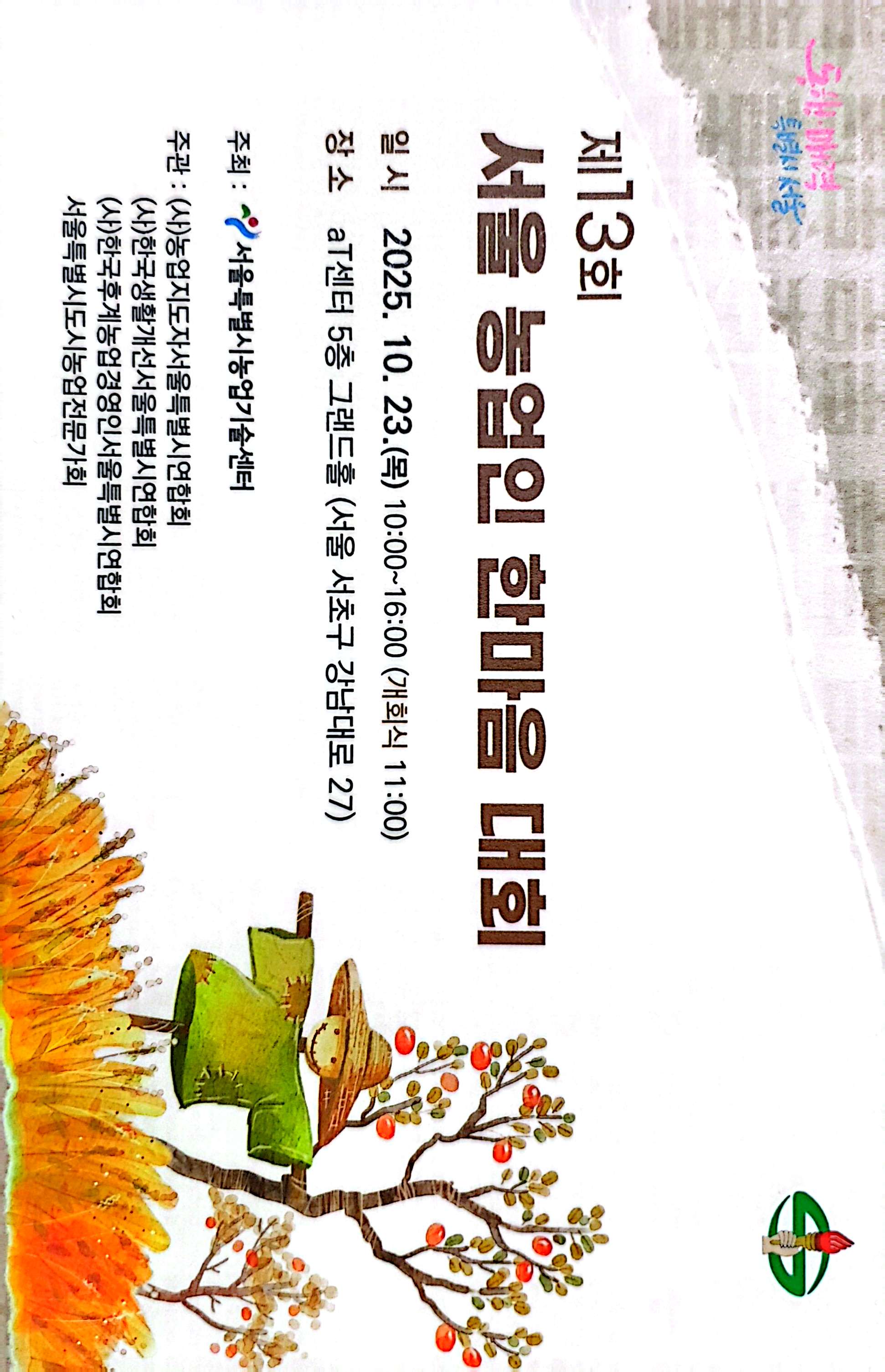 제13회 서울 농업인 한마음 대회 (2025.10.23) 작성자생활개선중앙연합회 등록일2025.10.02 조회수15 목록보기 PREV 2025 익산 농업기계박람회 (2025.11.4 ~7) NEXT 제28회 한국생활개선 강원특별자치도대회 (2025.10.30)